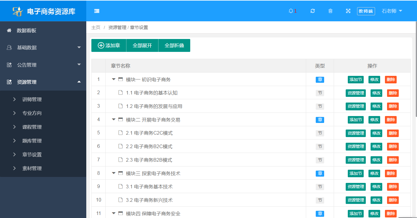 教師(shi)端(duan)的基礎(chu)數據包括數據看板,基礎(chu)數據,公告(gao)管理,資源(yuan)管理。數據統(tong)計(ji)(ji)包括班級統(tong)計(ji)(ji),學生統(tong)計(ji)(ji),專業方(fang)向(xiang),課程統(tong)計(ji)(ji),講師(shi)統(tong)計(ji)(ji),素材統(tong)計(ji)(ji),報表(biao)統(tong)計(ji)(ji)等。