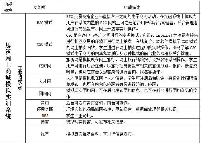 思(si)沃(wo)網(wang)上(shang)商(shang)城模擬實(shi)(shi)訓系(xi)統充分考(kao)慮到(dao)了試(shi)驗的具體(ti)情況,系(xi)統針對網(wang)上(shang)商(shang)城模擬實(shi)(shi)訓進行(xing)相關配置(zhi),學生可在系(xi)統中體(ti)驗網(wang)上(shang)B2C、C2C模擬商(shang)城開店實(shi)(shi)訓并結合(he)網(wang)絡環境的搭(da)建(jian)、數據庫運(yun)用知(zhi)識、團(tuan)購網(wang)、在線旅游網(wang)、在線人才網(wang)等進行(xing)多元性的實(shi)(shi)訓系(xi)統。