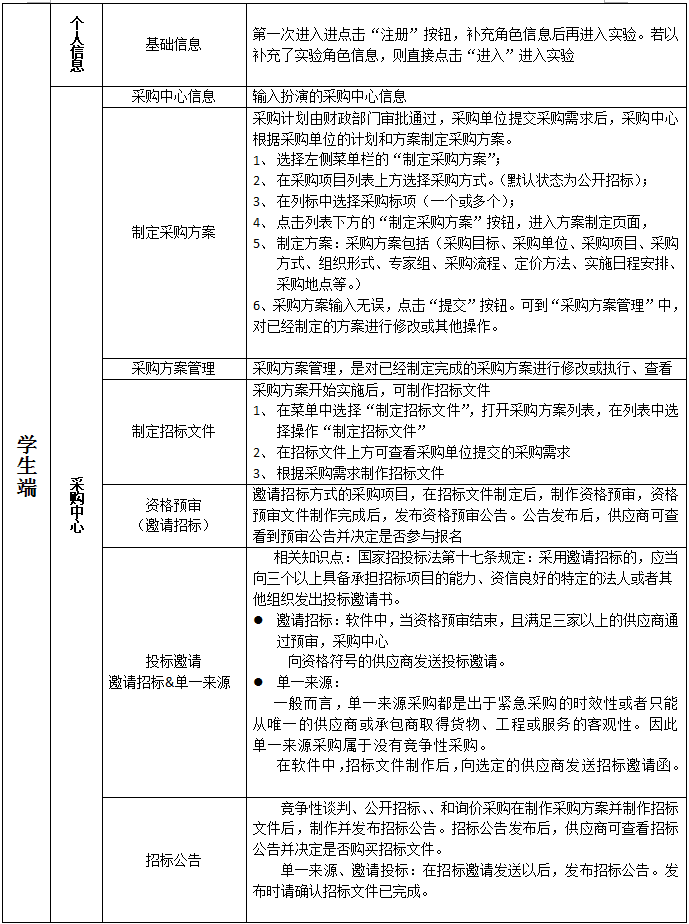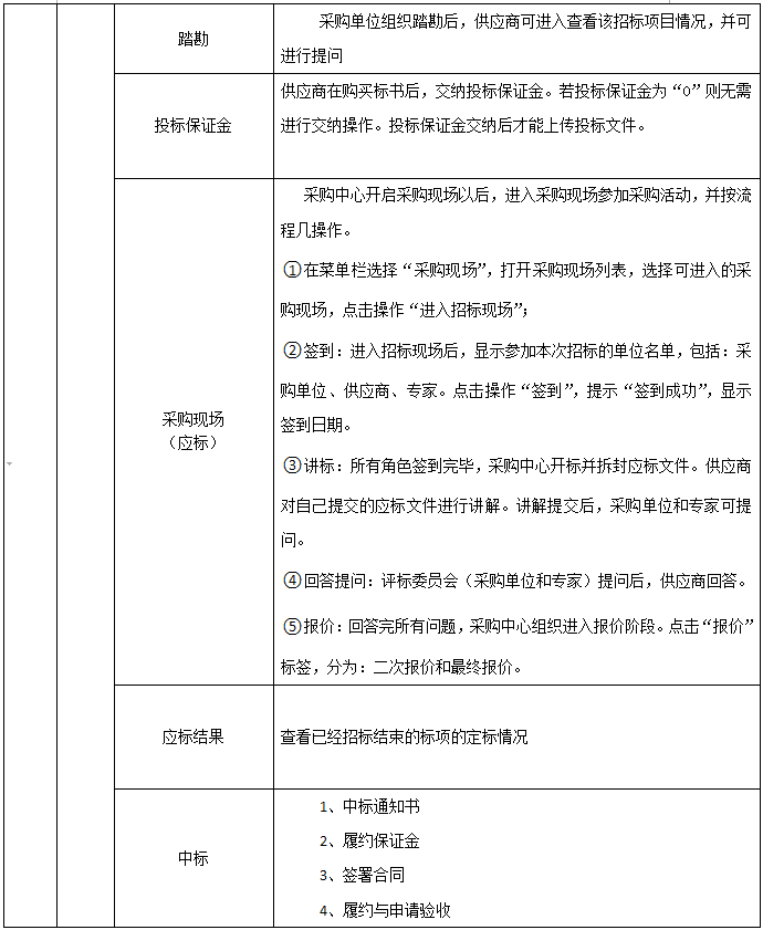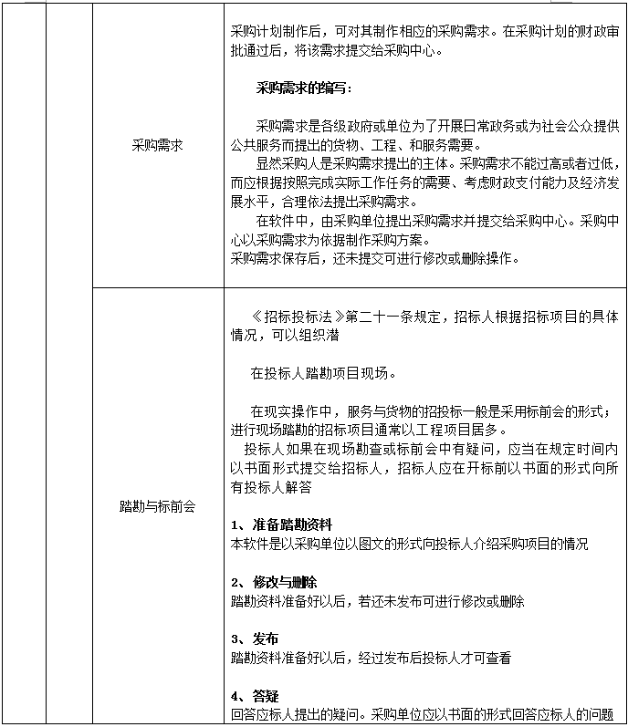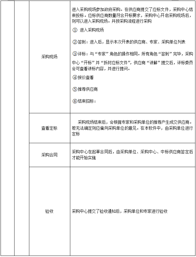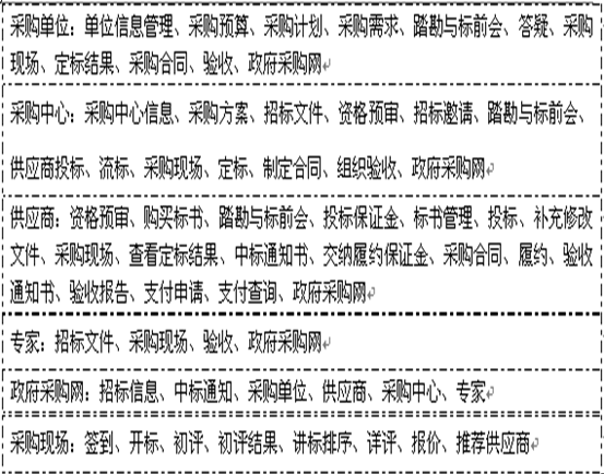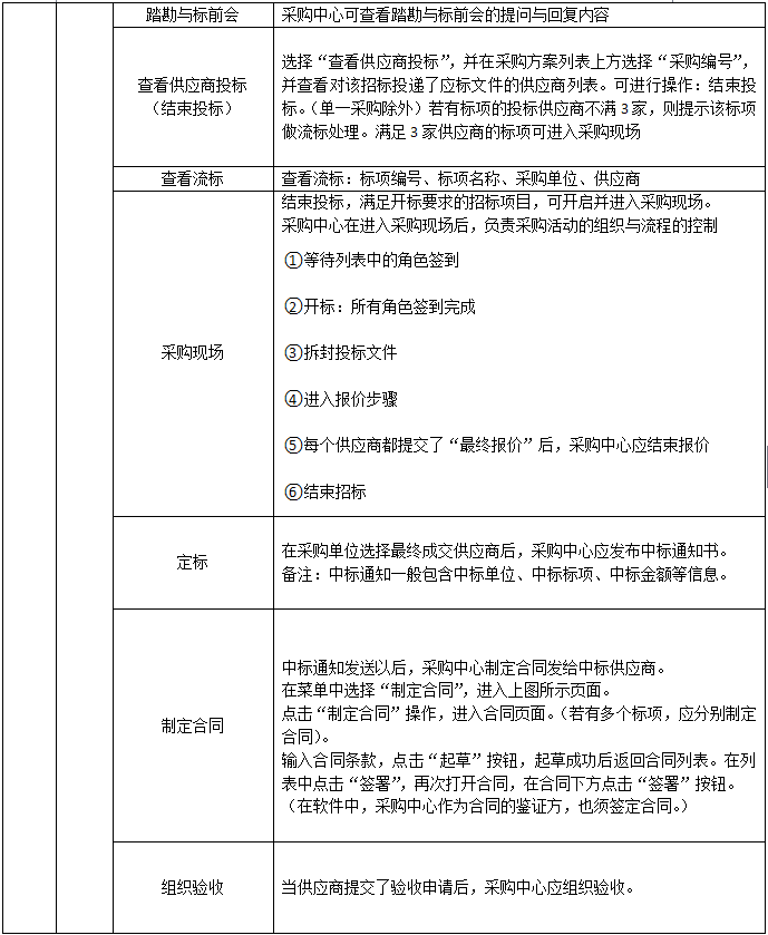 采購中心信息(xi)、制定(ding)采購方(fang)案、采購方(fang)案管(guan)理(li)制定(ding)招(zhao)標(biao)(biao)(biao)(biao)文件、資格(ge)預(yu)審(邀(yao)(yao)請(qing)招(zhao)標(biao)(biao)(biao)(biao))、投(tou)標(biao)(biao)(biao)(biao)邀(yao)(yao)請(qing)、邀(yao)(yao)請(qing)招(zhao)標(biao)(biao)(biao)(biao)&單一來源(yuan)、招(zhao)標(biao)(biao)(biao)(biao)公告、踏勘與標(biao)(biao)(biao)(biao)前會、查看供(gong)應(ying)商投(tou)標(biao)(biao)(biao)(biao)、(結束投(tou)標(biao)(biao)(biao)(biao))查看流標(biao)(biao)(biao)(biao)、采購現場、定(ding)標(biao)(biao)(biao)(biao)、制定(ding)合同、組織驗收(shou)