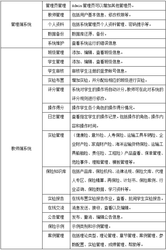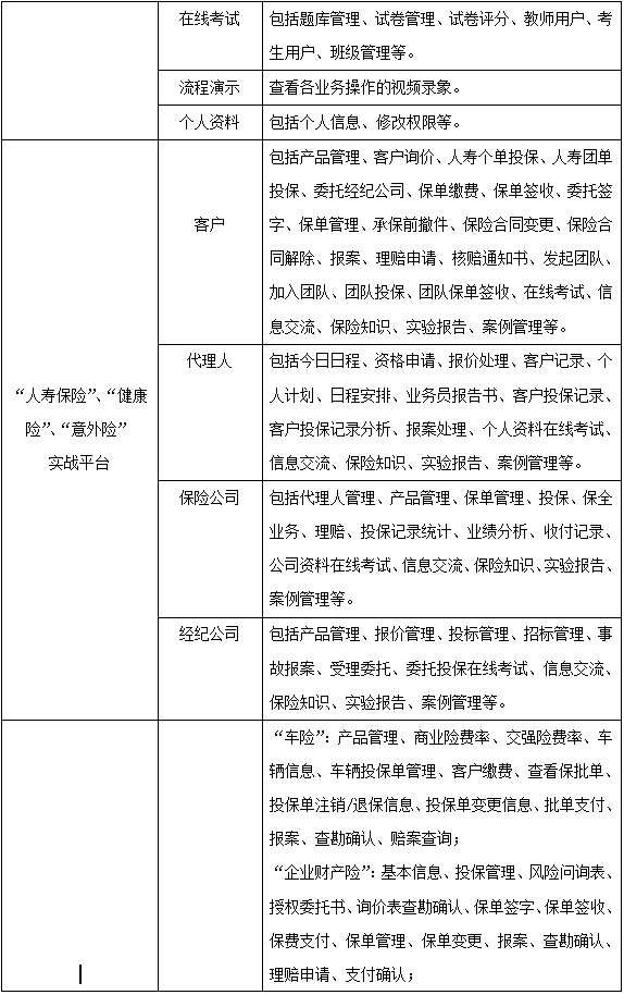 學生(sheng)通過飾演保(bao)(bao)險(xian)(xian)(xian)(xian)(xian)業(ye)(ye)務流程中(zhong)的(de)客戶、代理(li)人(ren)(ren)、經紀(ji)公(gong)(gong)(gong)司、人(ren)(ren)壽保(bao)(bao)險(xian)(xian)(xian)(xian)(xian)公(gong)(gong)(gong)司、財(cai)產保(bao)(bao)險(xian)(xian)(xian)(xian)(xian)公(gong)(gong)(gong)司五種角色,進入(ru)“人(ren)(ren)壽保(bao)(bao)險(xian)(xian)(xian)(xian)(xian)”和(he)“財(cai)產保(bao)(bao)險(xian)(xian)(xian)(xian)(xian)”實(shi)(shi)踐平臺,從展業(ye)(ye)投保(bao)(bao)環節開始,至索賠理(li)賠為止,全面(mian)操練(lian)保(bao)(bao)險(xian)(xian)(xian)(xian)(xian)核心業(ye)(ye)務中(zhong)的(de)投保(bao)(bao)、承保(bao)(bao)、核保(bao)(bao)、變更、理(li)賠、核賠等流程,使學生(sheng)的(de)知識結構提升(sheng),彌補實(shi)(shi)踐業(ye)(ye)務操作的(de)缺乏,實(shi)(shi)現對(dui)人(ren)(ren)壽保(bao)(bao)險(xian)(xian)(xian)(xian)(xian)、運輸(shu)(shu)工具車輛險(xian)(xian)(xian)(xian)(xian)、企業(ye)(ye)財(cai)產險(xian)(xian)(xian)(xian)(xian)、家庭(ting)財(cai)產險(xian)(xian)(xian)(xian)(xian)、海洋(yang)運輸(shu)(shu)貨(huo)物保(bao)(bao)險(xian)(xian)(xian)(xian)(xian)、運輸(shu)(shu)工具船舶險(xian)(xian)(xian)(xian)(xian)、責(ze)任險(xian)(xian)(xian)(xian)(xian)、工程險(xian)(xian)(xian)(xian)(xian)的(de)熟悉、掌握,對(dui)保(bao)(bao)險(xian)(xian)(xian)(xian)(xian)業(ye)(ye)務的(de)主要工作流程有一個(ge)清晰的(de)輪廓,為學以致用打(da)下堅(jian)固的(de)基礎(chu)。
