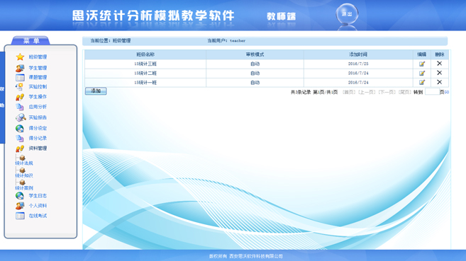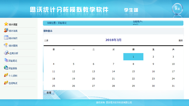 【學(xue)生端功能】:統(tong)計調查、統(tong)計法(fa)規、統(tong)計知識(shi)、統(tong)計案例(li)、應用(yong)分析、實(shi)(shi)驗(yan)筆記、實(shi)(shi)驗(yan)報告、個(ge)人資(zi)料、在線考試、幫(bang)助、退出系統(tong)。