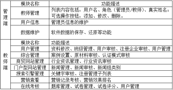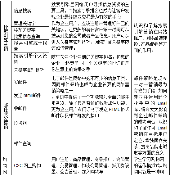 1、軟件用戶從初(chu)次訪問企業(ye)(ye)(ye)網(wang)站(zhan)到跟該企業(ye)(ye)(ye)訂購產(chan)品的(de)整個過程,可將其分成三個階段(duan):網(wang)站(zhan)建設階段(duan)、營(ying)銷(xiao)(xiao)推(tui)廣階段(duan)和在線(xian)業(ye)(ye)(ye)務管理階段(duan)。模塊中應包括(kuo):網(wang)站(zhan)建設、搜索引(yin)擎營(ying)銷(xiao)(xiao)、郵件推(tui)廣、網(wang)絡溝通、信息搜索與發(fa)布、搜索引(yin)擎優(you)化、網(wang)絡廣告制(zhi)作(zuo)、、客戶服務、在線(xian)銷(xiao)(xiao)售等(deng)技能的(de)專(zhuan)項實(shi)訓(xun),也能將專(zhuan)項實(shi)訓(xun)匯總,方便學生開展(zhan)企業(ye)(ye)(ye)網(wang)站(zhan)綜合營(ying)銷(xiao)(xiao)、作(zuo)出網(wang)絡營(ying)銷(xiao)(xiao)效果評估等(deng)的(de)集中實(shi)訓(xun)。