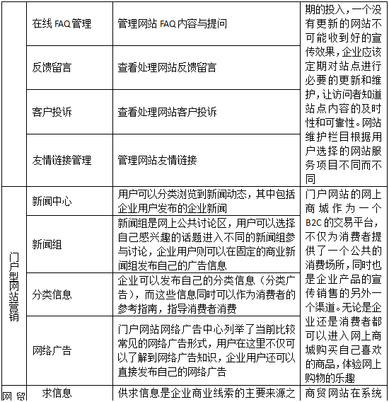 (2)企業網站管(guan)理與營(ying)銷:模塊什(shen)么時候需要(yao)維(wei)護?新聞管(guan)理有何用處(chu)?如何管(guan)理網站會員?FAQ對網站有什(shen)么幫(bang)助?是否留意反饋(kui)信息?是否解(jie)決顧客投訴?是否需要(yao)友情鏈接?